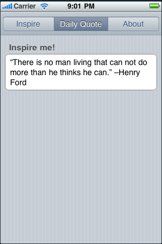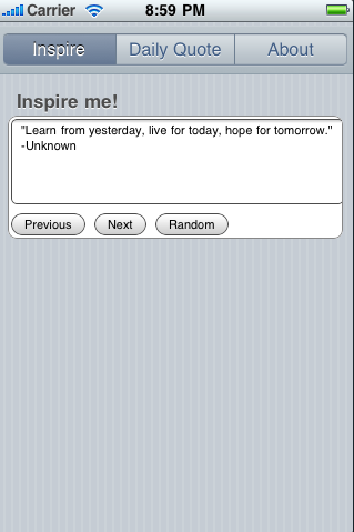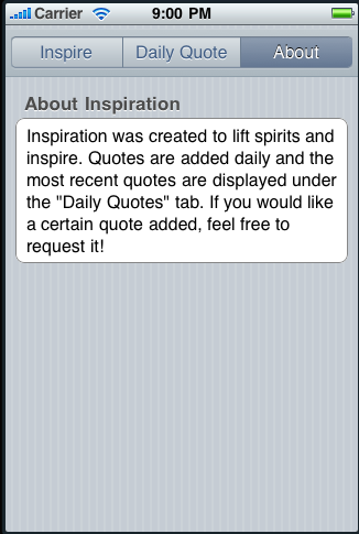 **Get Inspired**The inspire app was created to lift spirits and inspire people. Quotes are added daily and the most recent quotes are displayed under the "Daily Quotes" tab. If you would like a certain quote added, feel free to request it!
