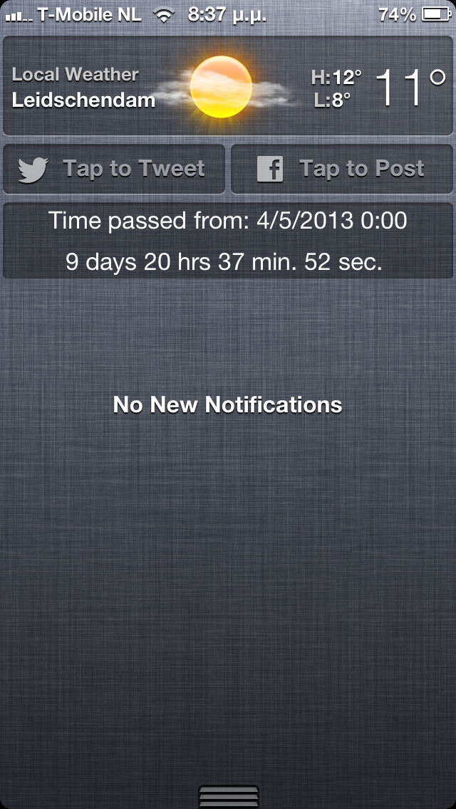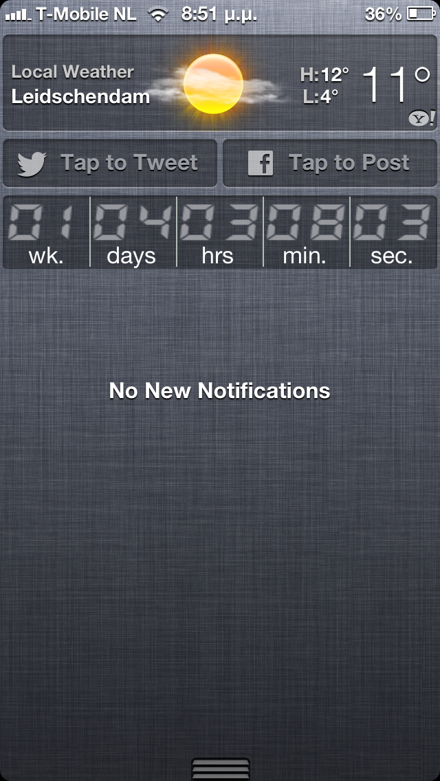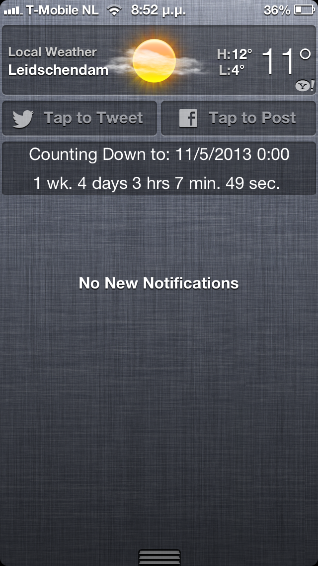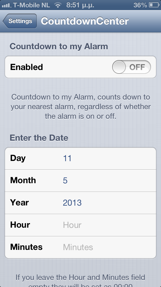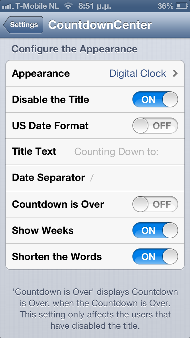 <p>Did you ever want to know how much time is left until a<br />special day like Christmas, your birthday or your summer holidays?<br />Then CountdownCenter is for you, featuring a customizable second by<br />second countdown right in your Notification Center. CountdownCenter<br />will show how many days, hours, minutes and seconds are left until<br />this special day. Just open the settings app, to configure which is<br />this special day for you. CountdownCenter can also how much time is left until your next alarm. Just set Countdown to my Alarm to on in the Settings of CountdownCenter.<br />The tweak is enabled by going to Settings>Notifications>CountdownCenter and setting the toggle to on.</p>
