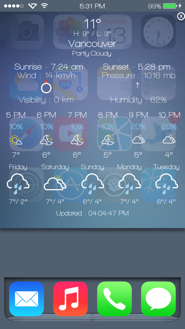 <p>The first is AnimatD Full Screen. It is a full screen animated weather iWidget that shows nicely over your icons on your screen. Also it has a touch function (info button top right corner in pics) that will display a 6 hour forecast, 5 day forecast and a host of other weather information. (see screenshots) Touch to show info, touch again to hide it.</p>