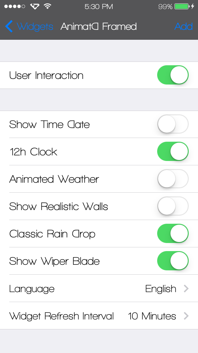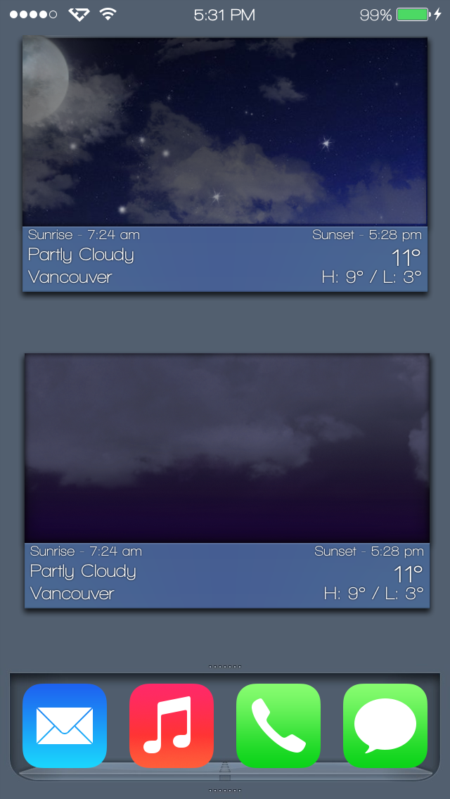 <p>The second iWidget is a smaller weather widget. AnimatD Framed. Features animated weather, minimal weather text information in a nicely designed frame. It also has a static weather option if you choose not to use it as animated. Select Animated Weather off and also turn off Realistic Walls so it shows static weather images that are just like some of the images in iOS7 weather app. The widget shows twice in one screenshot, the top is the animated version, the bottom is the static version. I have also included a screenshot to show what options to select for the static weather to look the best.</p>