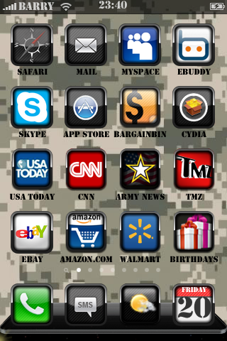 A complete Army ACU Theme. This theme includes Dialer, Lockscreen Background, Springboard Wallpaper, a complete Icon Set and a battery charging theme. Special thanks to Hockey/Ace Ventura the developer of IBOX Carbon for allowing me to use his outstanding icon package for this theme. Over 2000+ icons available. Follow this link to get them all http://www.marcovanveelen.nl/carbon. Any questions or comments feel free to email me. Thank you and enjoy.