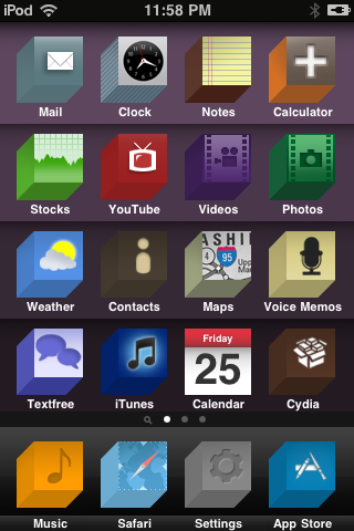 Winterboard Theme; Includes Wallpaper, support for 100+ icons, Badges, Lockscreen Battery, and Folders. If you remove the default Dock, download "Transparent Dock iOS4" from Cydia and activate through Winterboard (under the name "Transparent Dock 4.0") A matching Blocks SBSettings theme is also available :^)