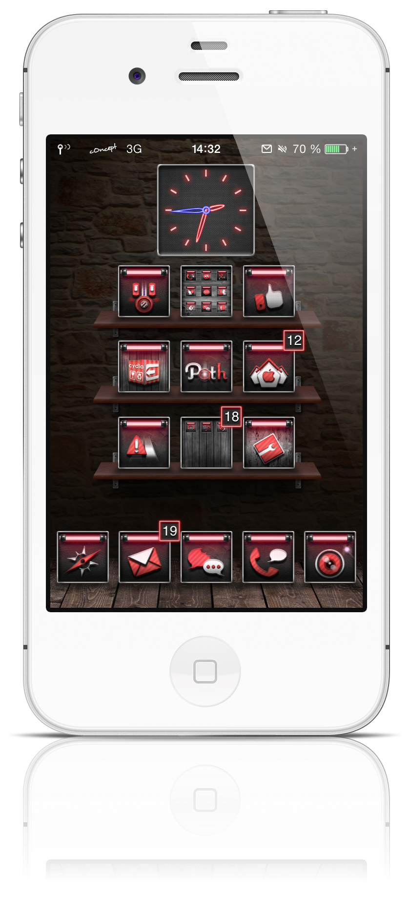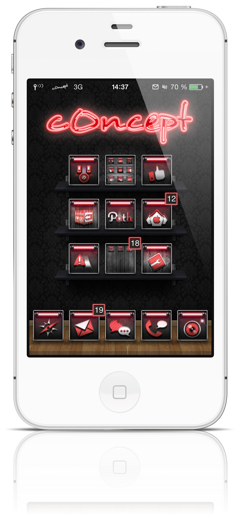 <p align="center"><strong>c0ncept</strong> will give a new colorized look to your favorite iDevice… with a new stat bar style, CK, iWidgets, iconOmatics, classicdocks, Loading pages, zeppelins, groovylock, FolderIcons, wallpapers, settings icon, UIImages, and more than 150 icons…</p>