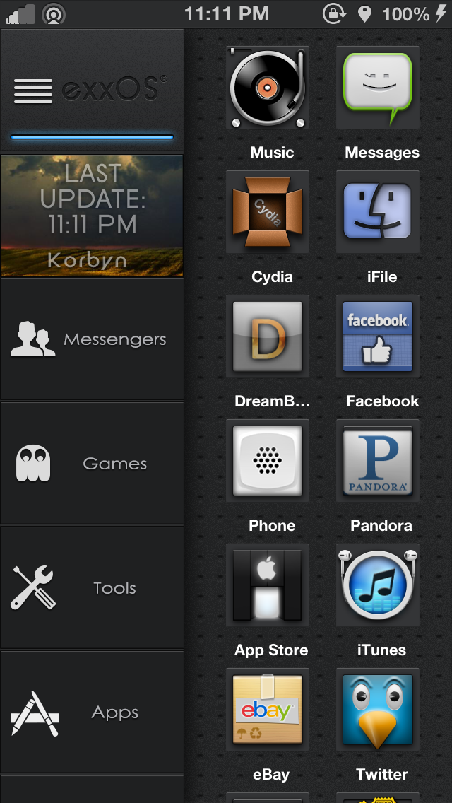 <p style="text-align: center;"><span><strong>exxOS 5</strong> is a brand new DreamBoard theme designed by bluemetal, and coded by korbyn8495 especially for the <em>iPhone 4s, iPhone 4, and iPod Touch 4th Generation and lower</em>. The theme features a unique organization, that uses a sidebar to scroll through major categories. The theme also includes an SBSettings UI, Calculator UI, Music Player UI, 45 hand designed icons, a lockscreen UI, complete weather widget with date and local temperatures and times, and the ability to display a custom picutre and name! The theme will also include several more major updates adding new features and graphics!</span></p>