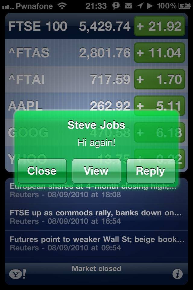 A theme for the iPhone 4 which changes popup boxes (texts, notifications, battery warnings) green! Get rid of those shoddy iPhone-esc blue boxes!