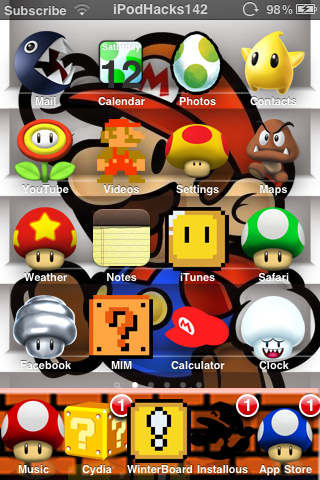 The best Mario theme on cydia, has icon, battery, lockscreen, sounds, wallpaper and sliders.Thanks to JOEGAS who provided some of the images in this theme.(For iPod Touch)Watch me on YouTube.Go see the website:www.iPodHacks142.Moonfruit.com