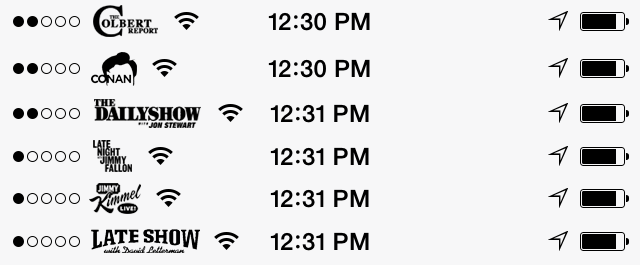 <p>The Late Night TV Zeppelin Pack contains icons for Late Night w/ David Letterman, The Colbert Report, Conan, The Daily Show w/ Jon Stewart, Late Night w/ Jimmy Fallon, and Jimmy Kimmel Live.</p>