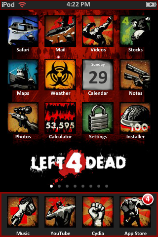 A Left 4 Dead theme that includes the achievement icons and custom wallpapers. To get the other wallpapers, please SSH into your iPhone/iPod Touch to change. For use with WinterBoard.